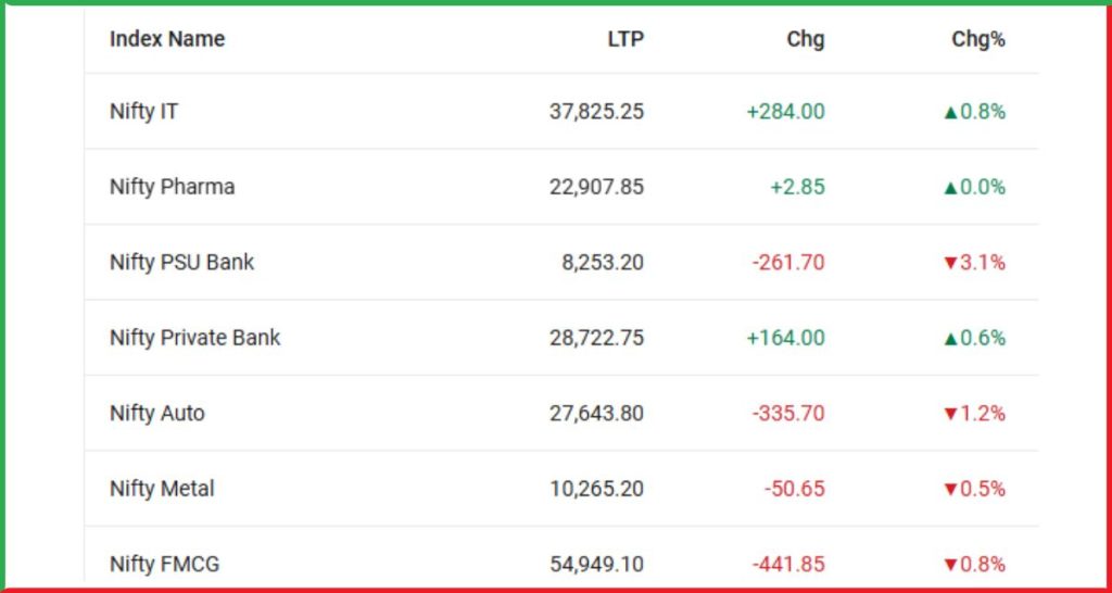 IT सेक्टर पूरे दिन मजबूत बना रहा, जबकि PSU Bank इंडेक्स में भारी बिकवाली देखने को मिली।