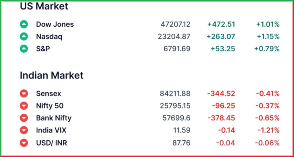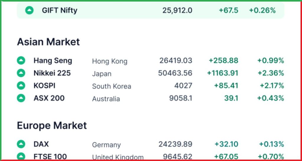 Gift Nifty लगभग 25,912 पर ट्रेड कर रहा था, जो Nifty Futures के पिछले क्लोज से 121 पॉइंट ऊपर है। यह इशारा करता है कि आज भारतीय शेयर बाजार में Gap-Up Opening देखने को मिल सकती है।